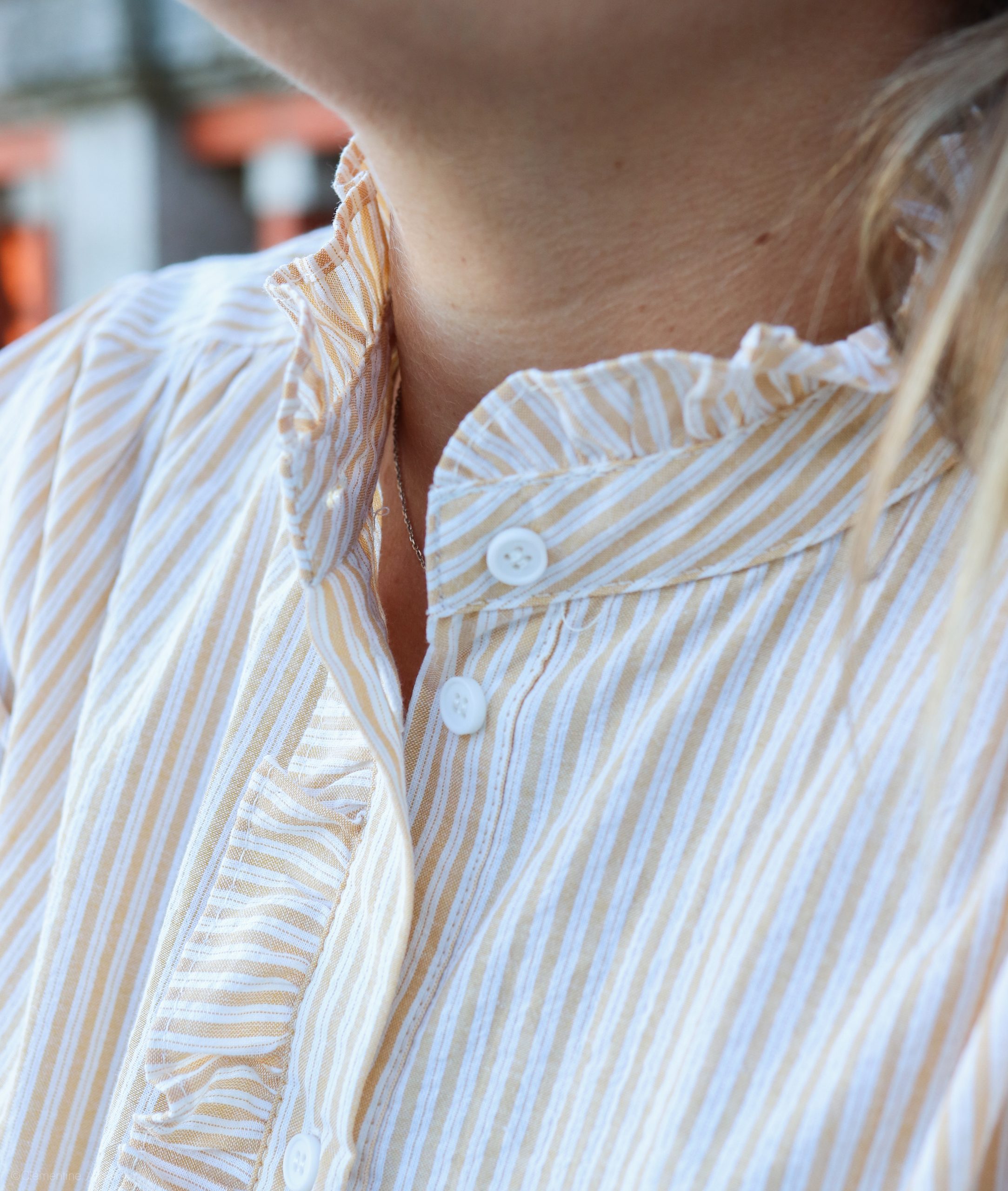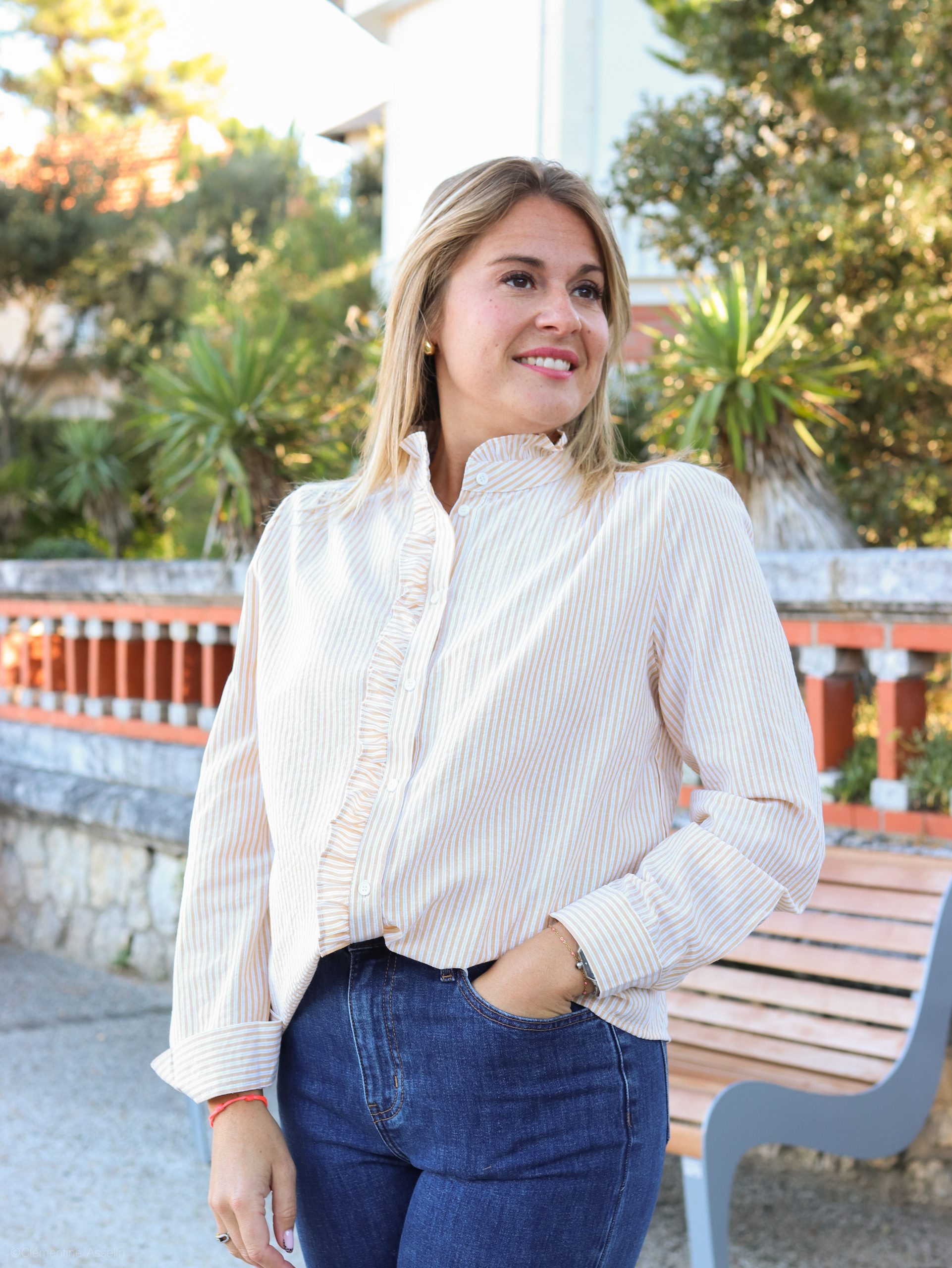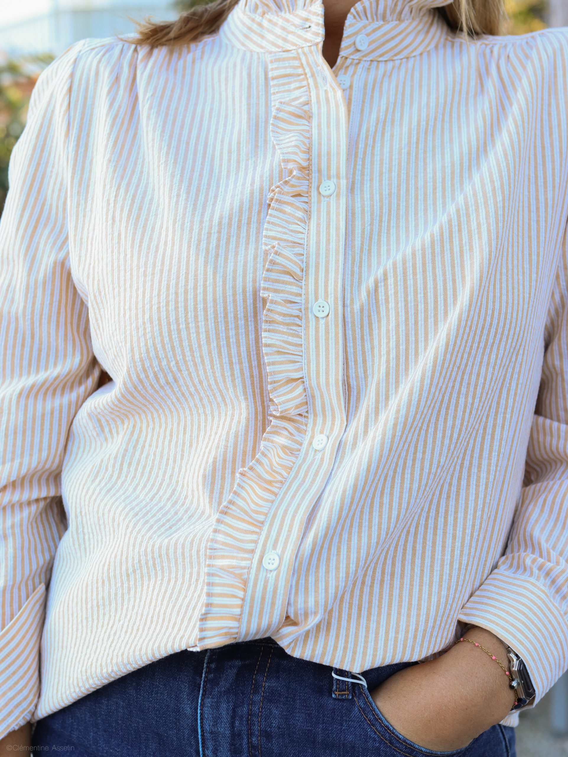 La chemise “Anouck” allie élégance et romantisme dans un style à la fois moderne et intemporel. Son imprimé à fines rayures est sublimé par un volant délicat tout le long du boutonnage, et son col volanté apporte une touche chic et féminine. Légère et raffinée, c’est la pièce parfaite pour celles qui aiment les détails subtils et le charme discret.
