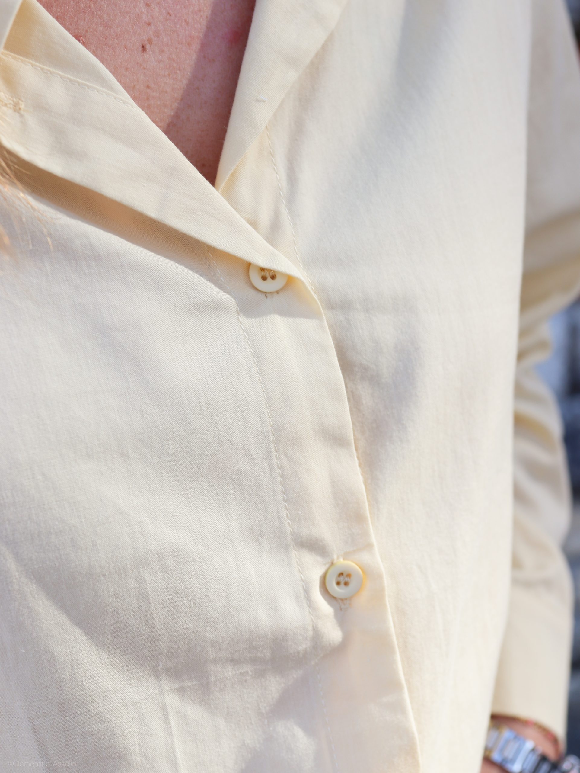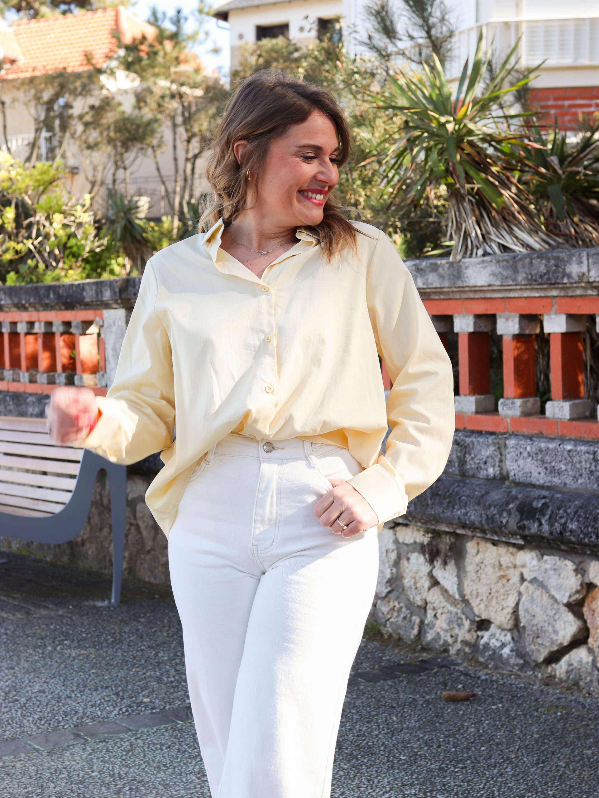 La chemise jaune… avec un twist irrésistible. Classique à l’avant, cette chemise révèle toute sa singularité dans le dos avec un joli détail ajouré en dentelle. Une pièce élégante qui joue sur les contrastes entre sobriété et féminité. Parfaite pour apporter une touche de raffinement inattendue à tes tenues du quotidien.