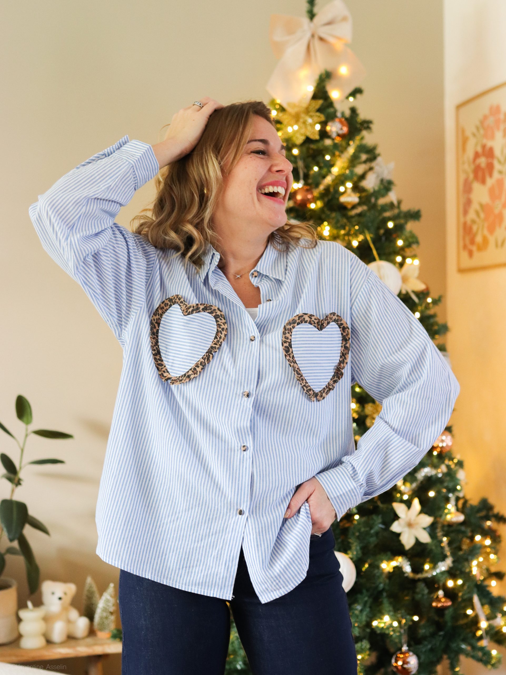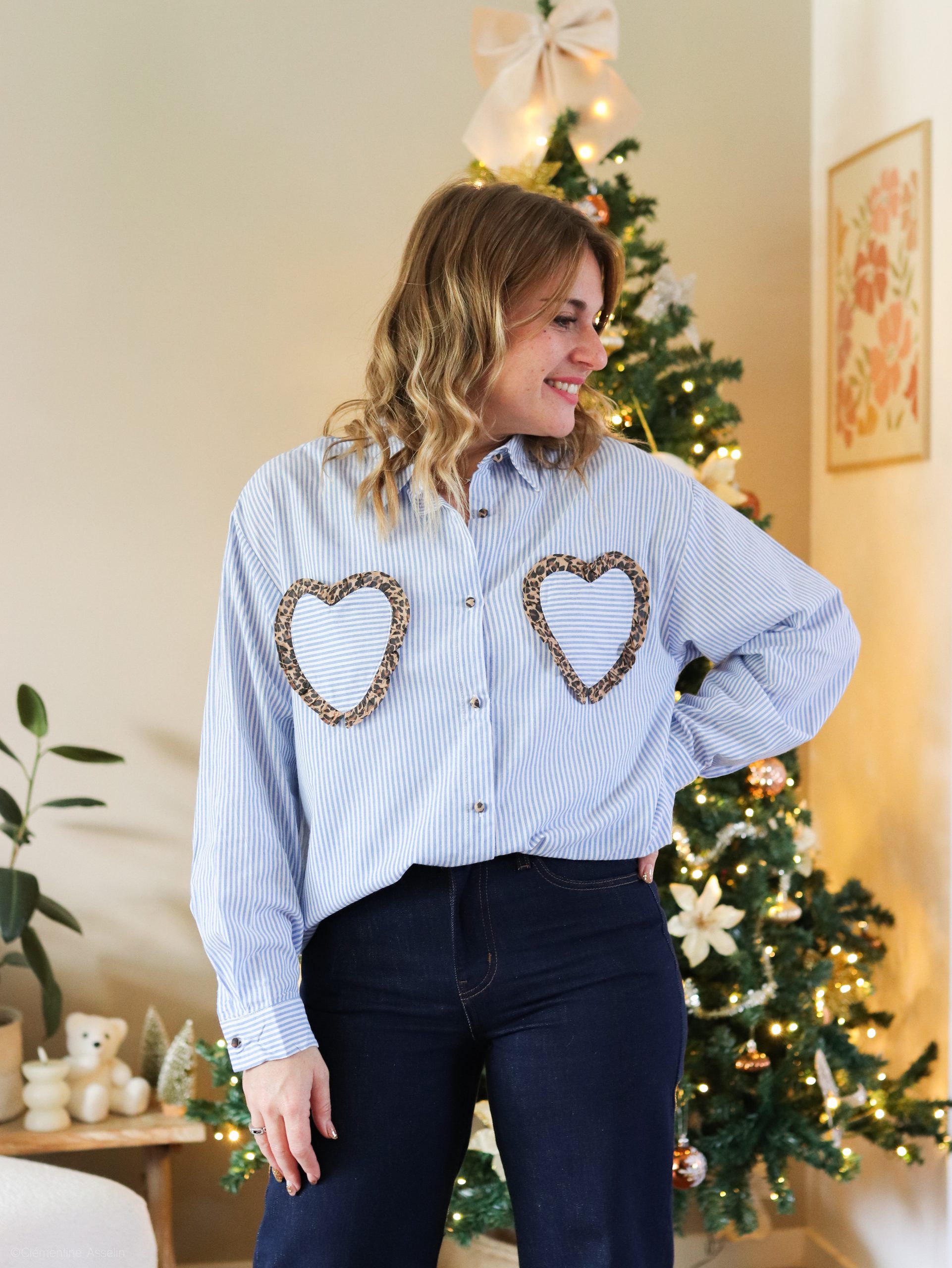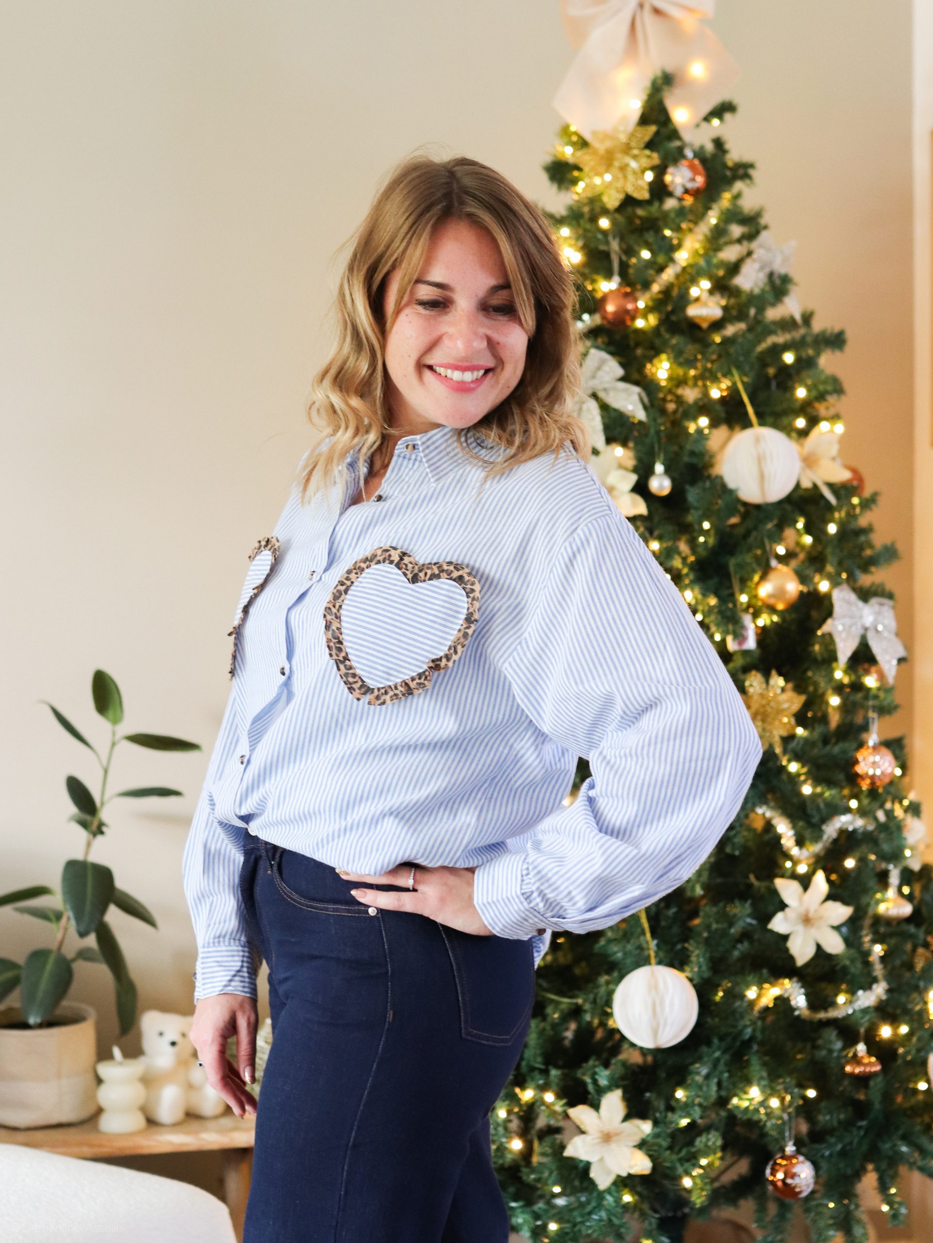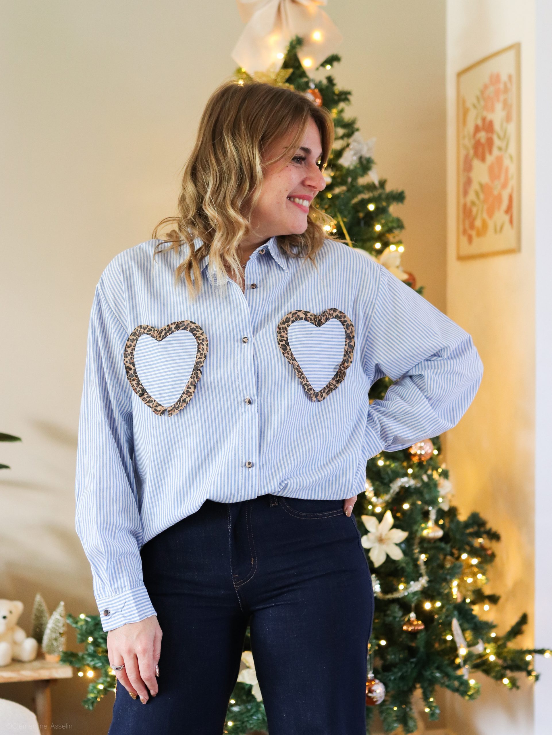 Originale et féminine, cette chemise à rayures fines bleues se distingue par ses empiècements en tissu léopard en forme de cœur au niveau de la poitrine, apportant une touche audacieuse et tendance. Sa coupe élégante et son tissu agréable à porter en font une pièce forte, idéale pour rehausser une tenue simple.