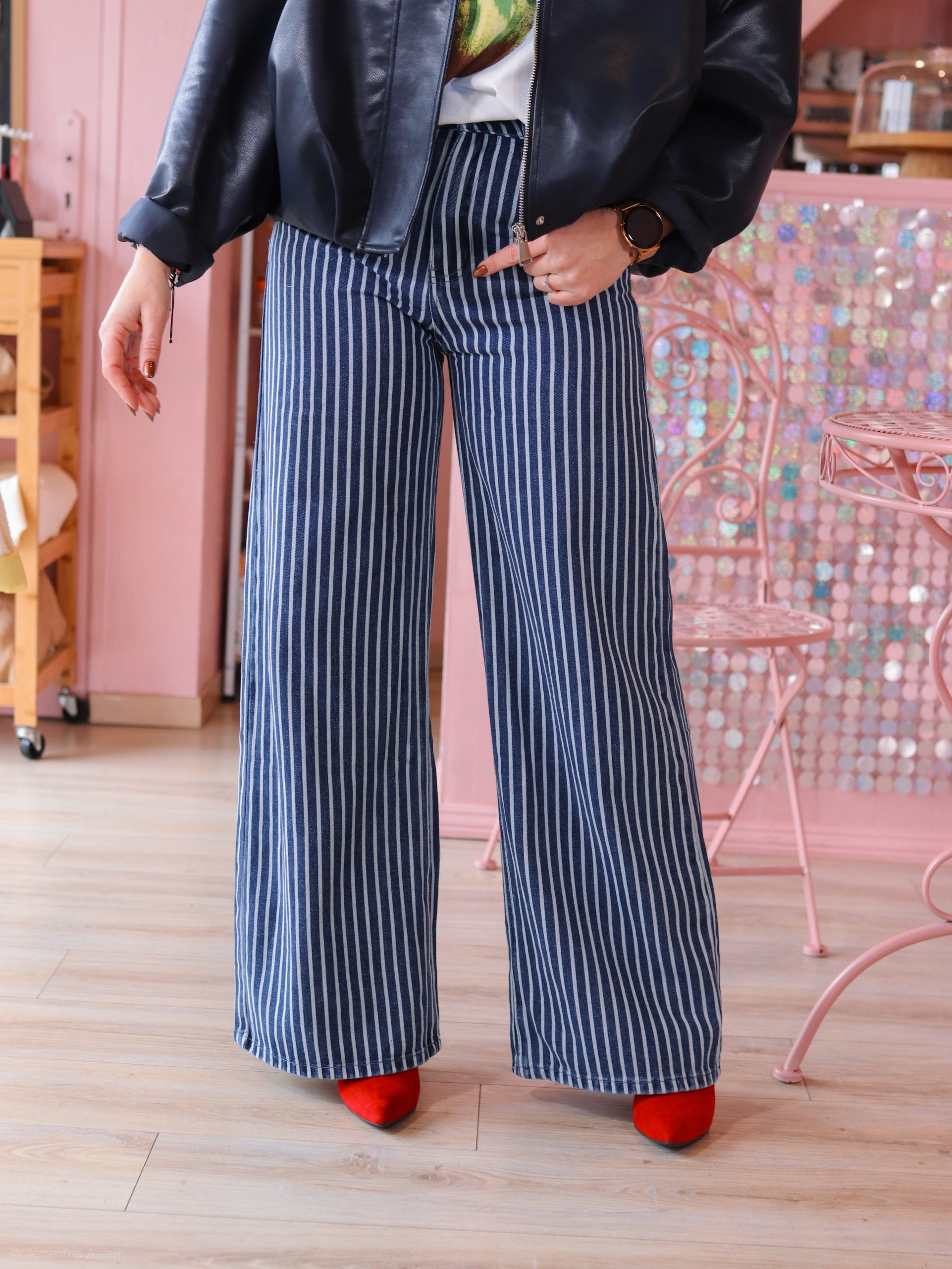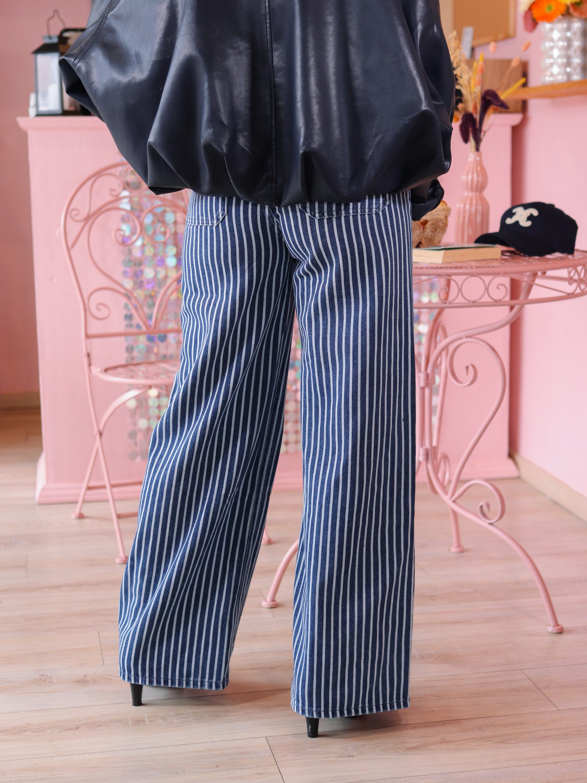 Ce pantalon large à rayures est la pièce parfaite pour une silhouette élégante et tendance. Sa coupe fluide et taille haute allonge la jambe, tandis que les rayures verticales apportent une allure chic et structurée.
