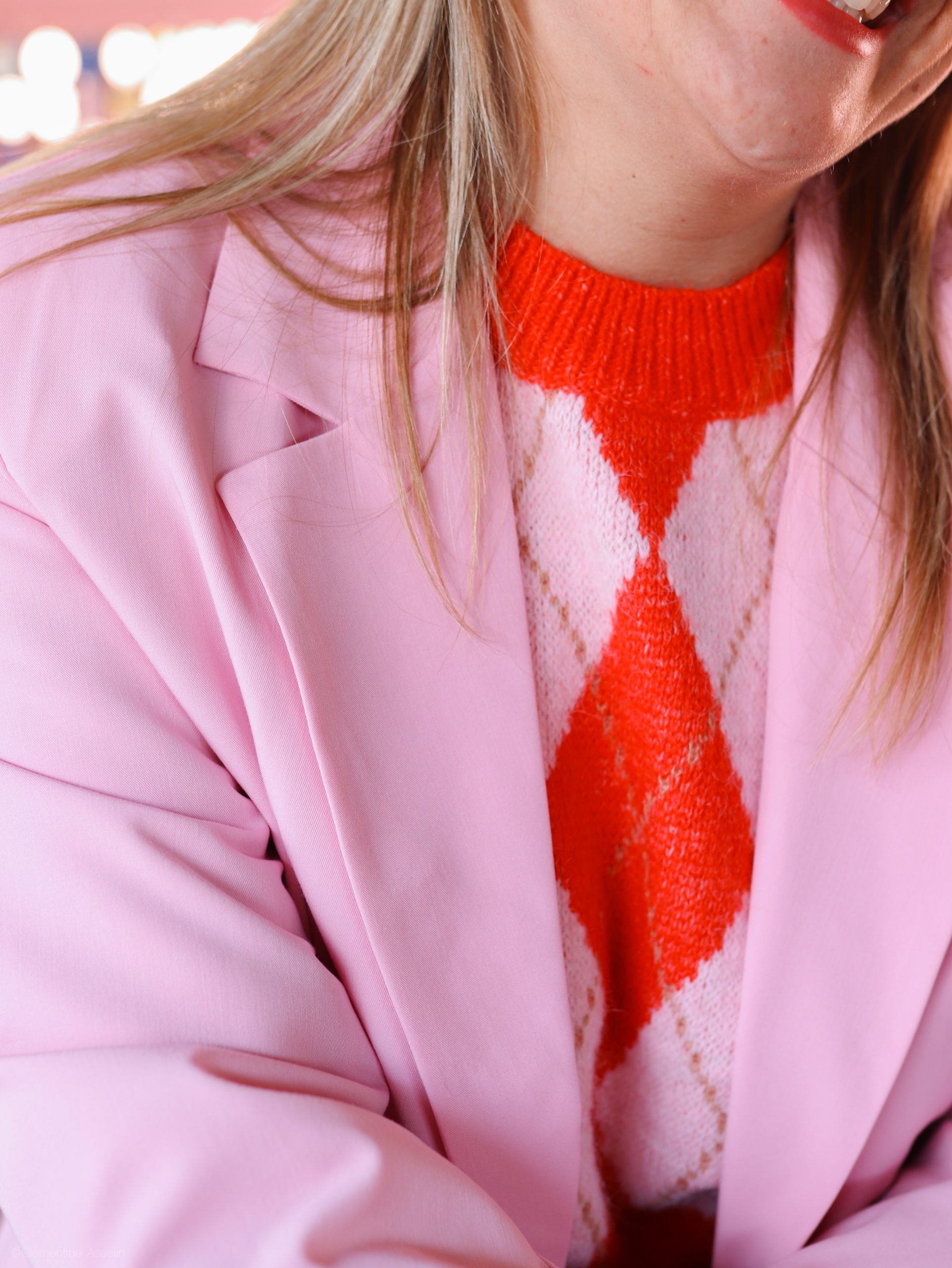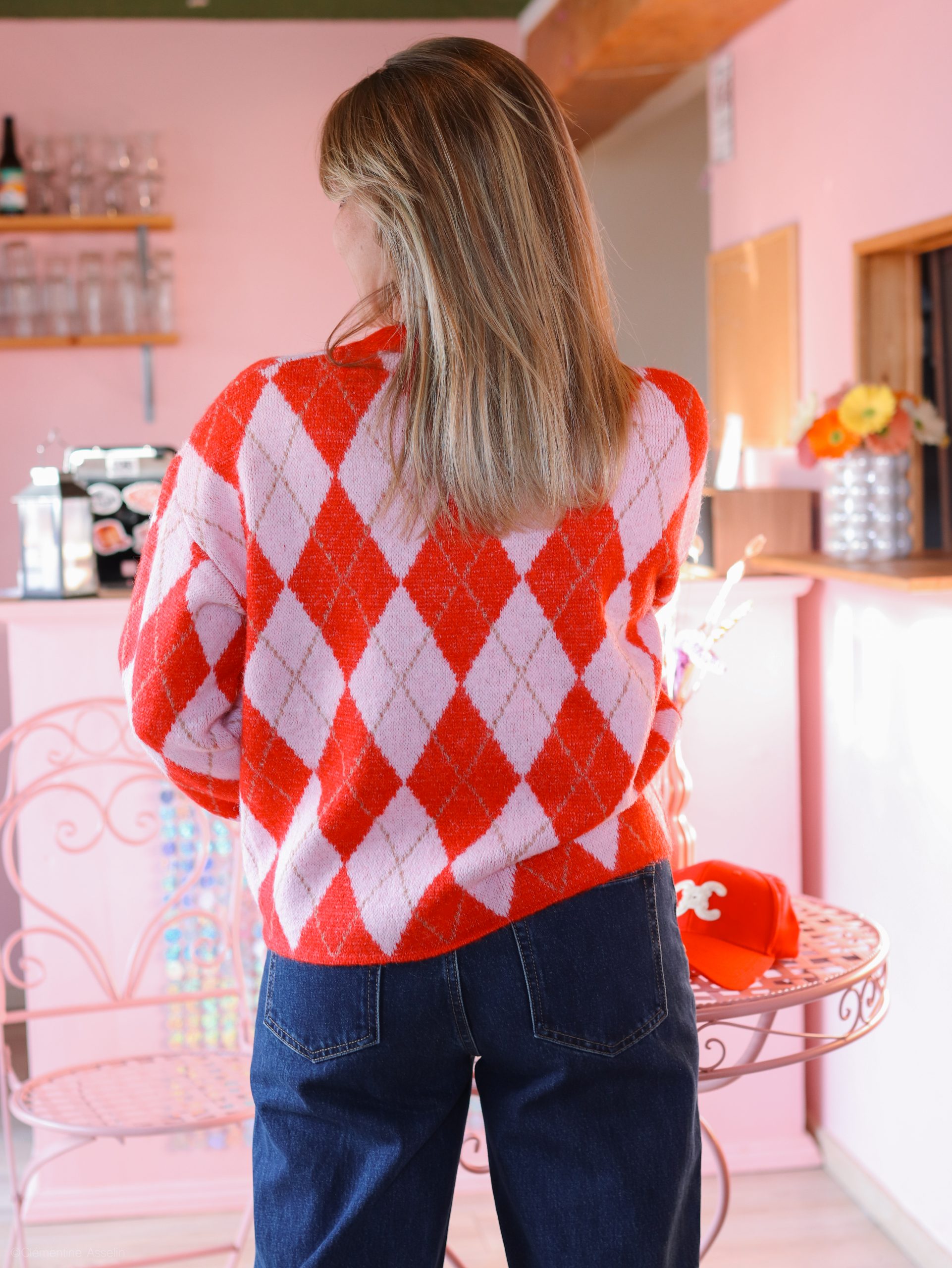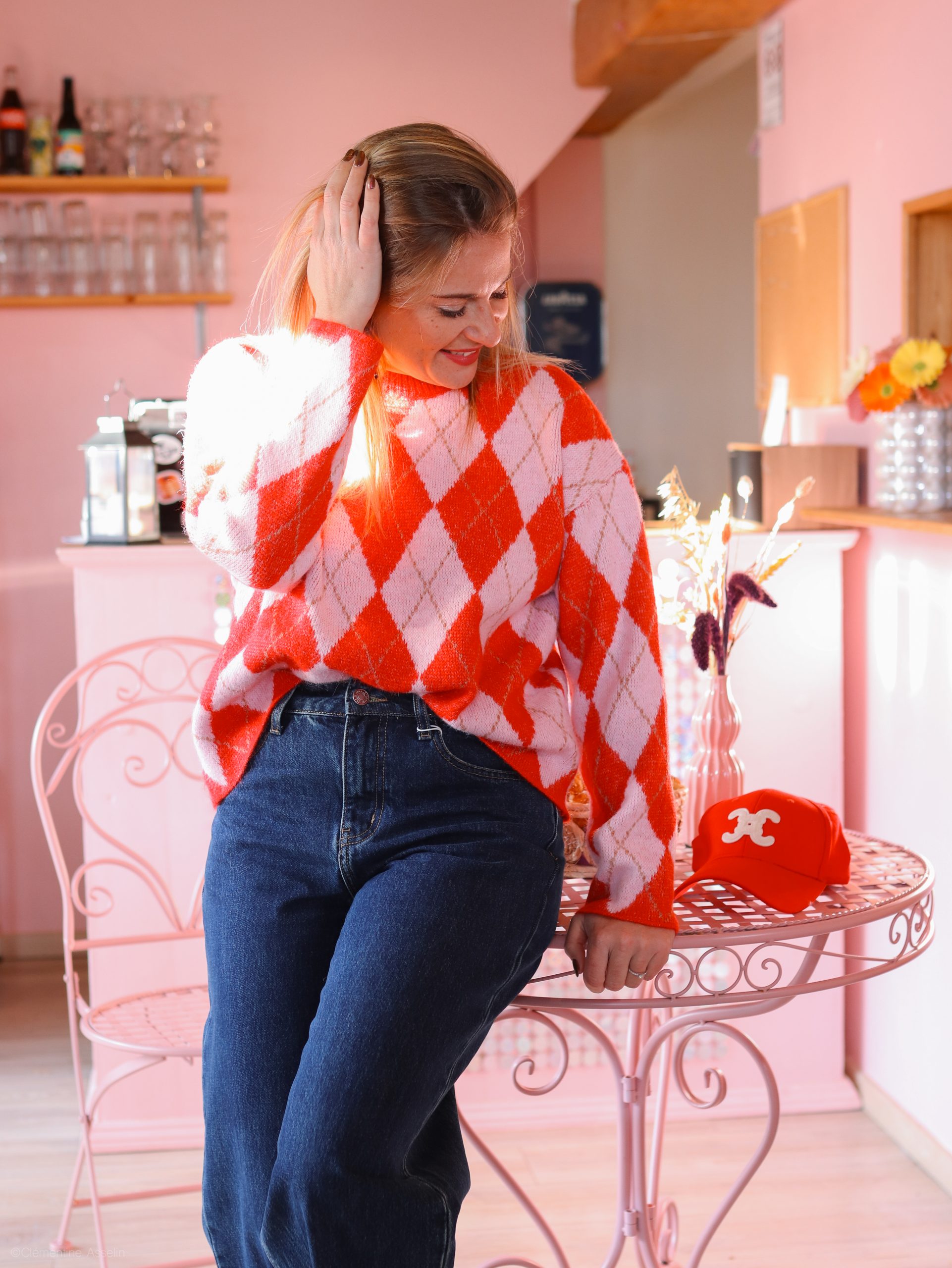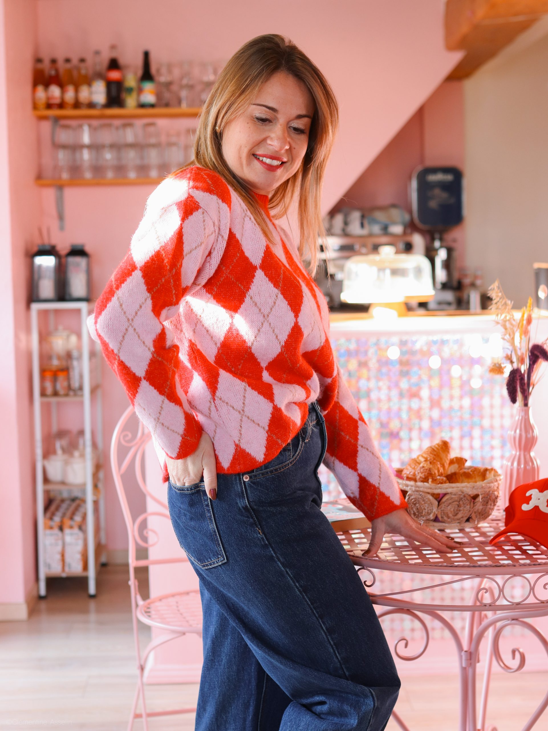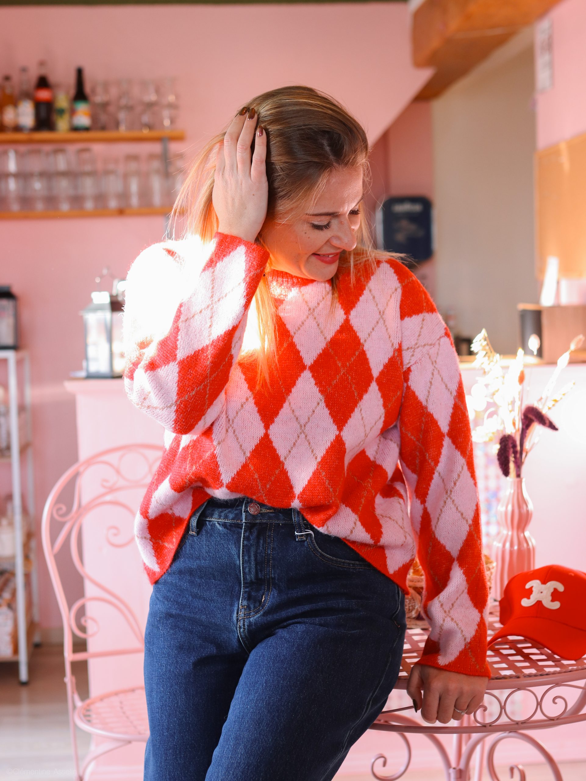 Impossible de passer à côté de ce pull à motif losanges rouge et rose, une pièce forte et ultra tendance qui réchauffe instantanément la silhouette. Son imprimé type argyle apporte un look à la fois rétro, chic et moderne. Il se porte hyper facilement avec un jean taille haute pour un style casual chic, ou avec une jupe pour une touche plus féminine. La maille est douce, confortable et agréable à porter : le pull parfait pour être stylée sans sacrifier le confort.