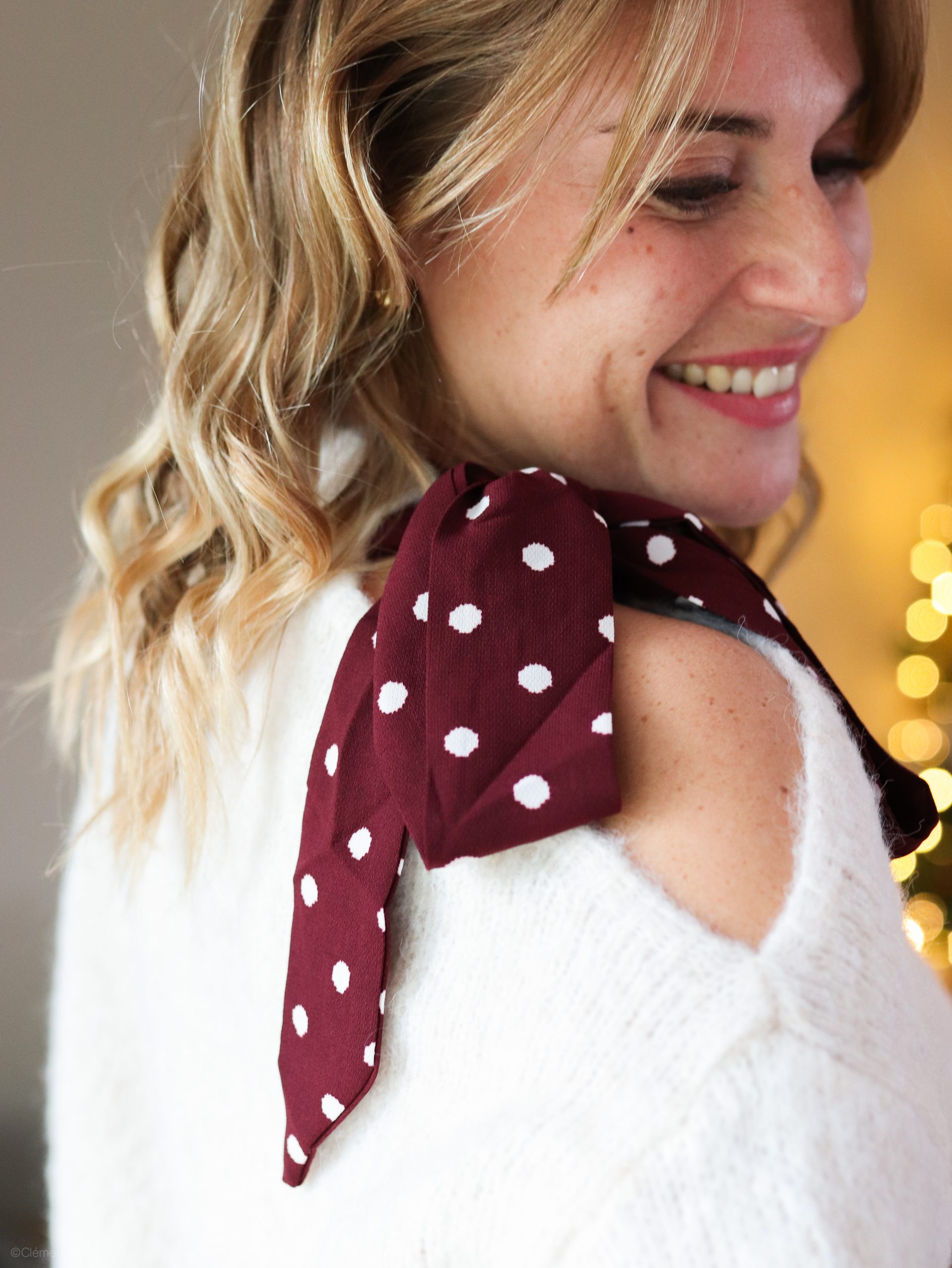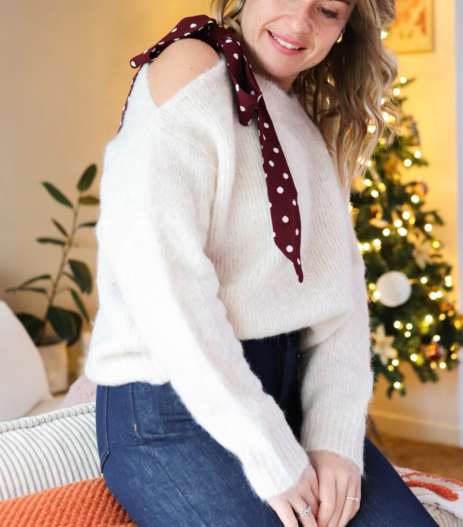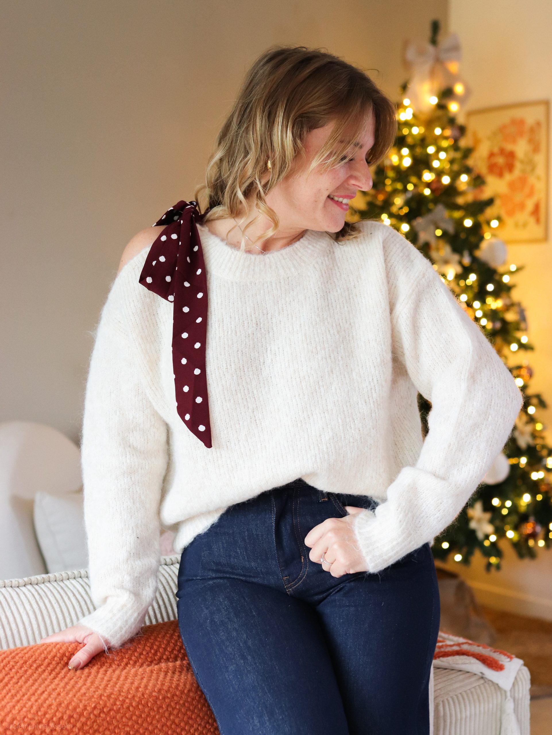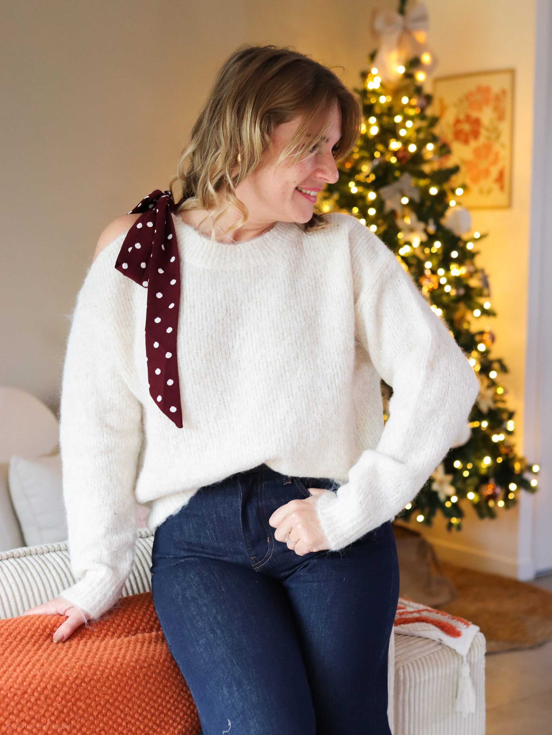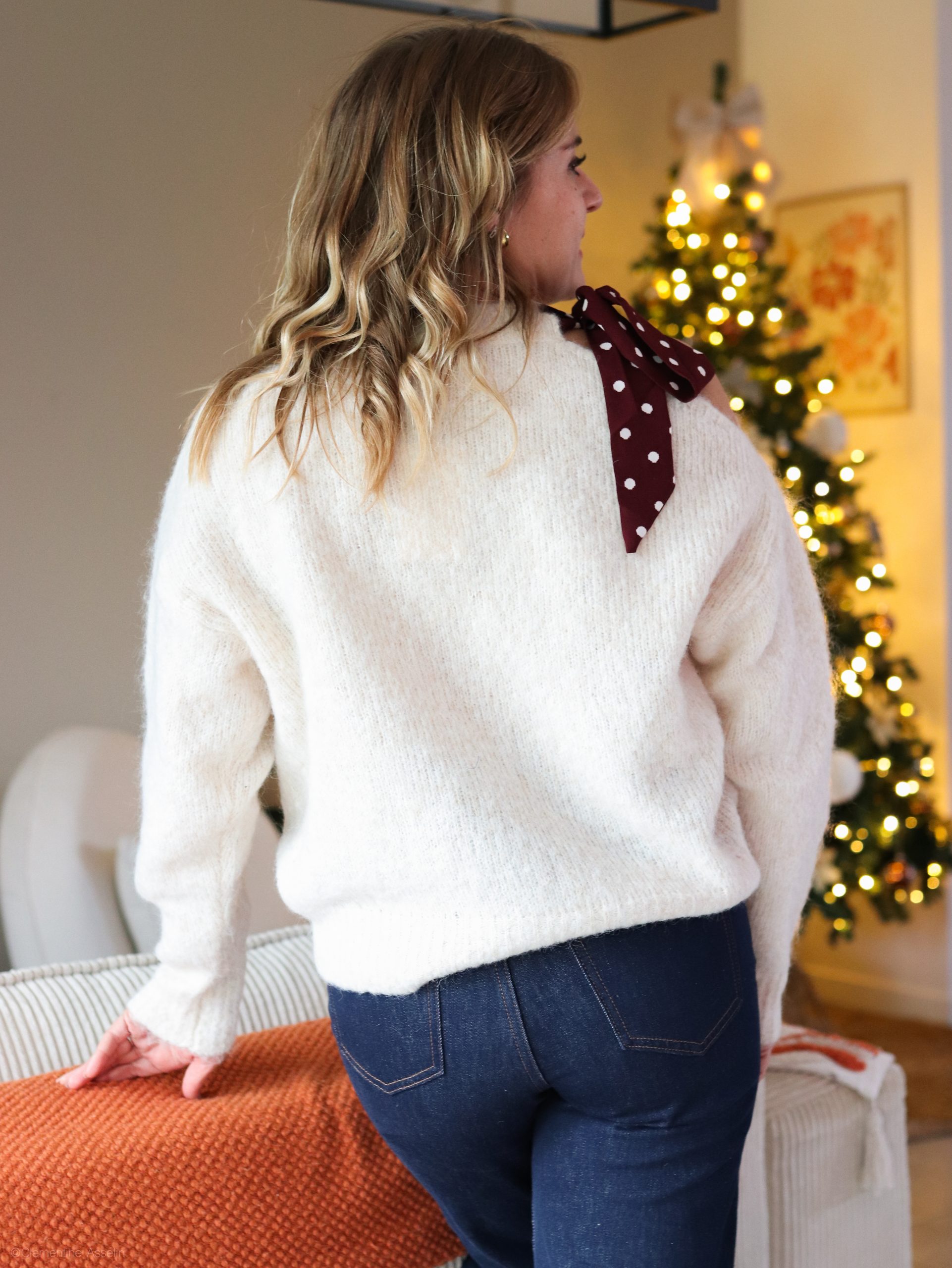 Féminin et délicat, ce pull blanc se distingue par son épaule ajourée subtilement dévoilée, apportant une touche de sensualité tout en élégance. Son détail phare : un joli nœud bordeaux à pois blancs, qui contraste parfaitement avec la douceur de la maille. Une pièce pleine de charme, idéale pour un look chic et romantique.